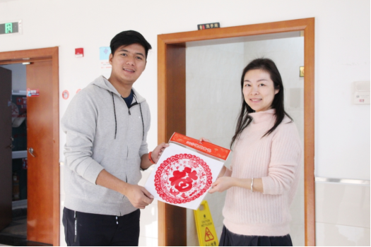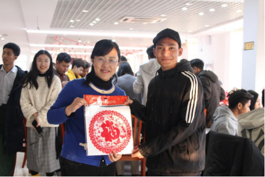 期间,老师们为在场的留学生们送上了他们的新年祝福,一张福字窗花,并和他们亲切合影,虽然礼物并不如何贵重,但其间的拳拳祝福之心却是情真意切。收到了新年祝福的同学们也是笑容洋溢。