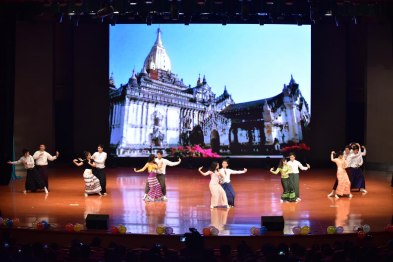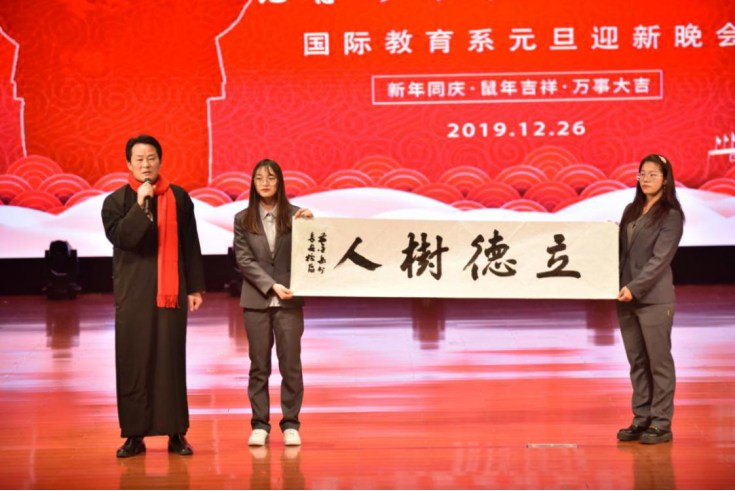 晚会在街舞社的精彩表演中拉开了序幕,系部领导、老师与外教们以视频的方式为大家送来了元旦祝福。《夜空中最亮的星》嘹亮的歌声,《小王子》与《疯狂动物城》的精彩配音,给大家带来了一次又一次的惊喜。缅甸留学生热情的歌曲与舞蹈,呈现出一个异国风情的《水调歌头》。黄轶璠的古筝弹奏更让大家体验了一把古人的闲情雅致。蒋金岳老师的现场书法展示,再次掀起了晚会的高潮,他提笔写出“立德树人”四个字,并寄语学生们要注重培育良好的道德品质。舞蹈《Miracle》活力四射,朗诵《中国少年说》也激情澎湃。