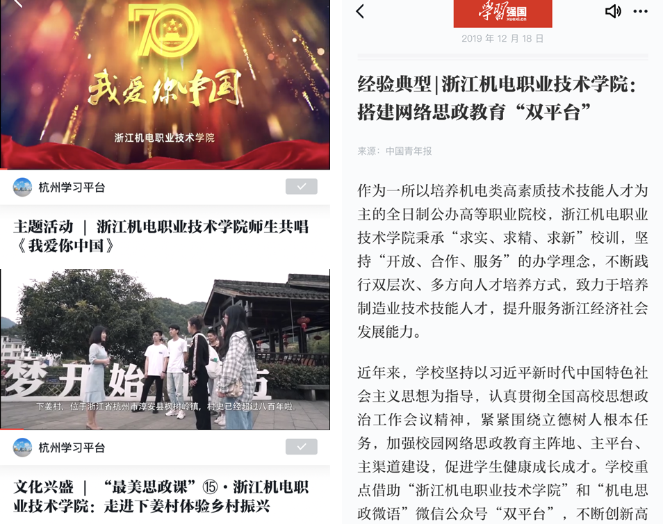 11月28日,“学习强国”平台以《主题活动|浙江机电职业技术学院师生共唱<我爱你中国>》为题,关注我院庆祝中华人民共和国成立70周年系列活动;12月6日,以《文化兴盛|“最美思政课”·浙江机电职业技术学院:走进下姜村体验乡村振兴》为题,关注我院新形态思政课;12月18日,以《经验典型|浙江机电职业技术学院:搭建网络思政教育“双平台”》为题,关注我院思政网络在线平台建设成果。