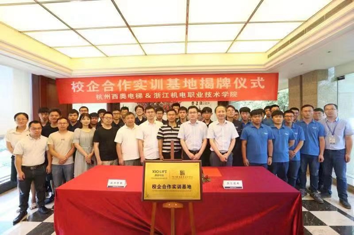 在大家的见证下杭州西奥电梯有限公司常务副总裁王国卿和我院党委委员丁明军进行了校企合作签约和授牌。