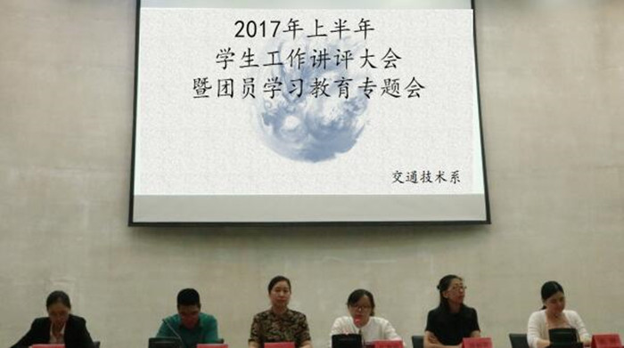 5月24日晚,交通技术系2017年上半年学生工作讲评大会暨团员学习教育专题会在综合楼4楼报告厅举行,交通技术系直属党支部书记宋伟文、系办公室主任兼学工办主任任嘉祺、辅导员姚婷、大二班主任以及全体大二学生参加了此次会议。