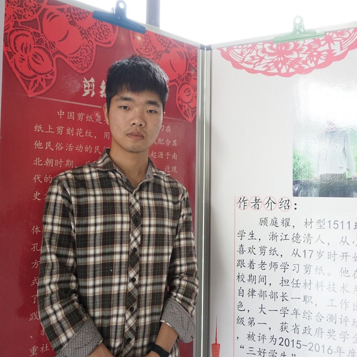 本次展览的作品有“高举廉政”、“出淤泥而不染”、“廉洁之钟”、“清正廉明”等20余幅剪纸作品,作品全部由材料技术系材型1511班学生顾庭耀花费一个多月时间精心完成,基本上每幅作品需要花费两天时间。顾庭耀同学17岁时接触到剪纸文化,就产生了浓厚兴趣,并从师开始学习剪纸艺术。