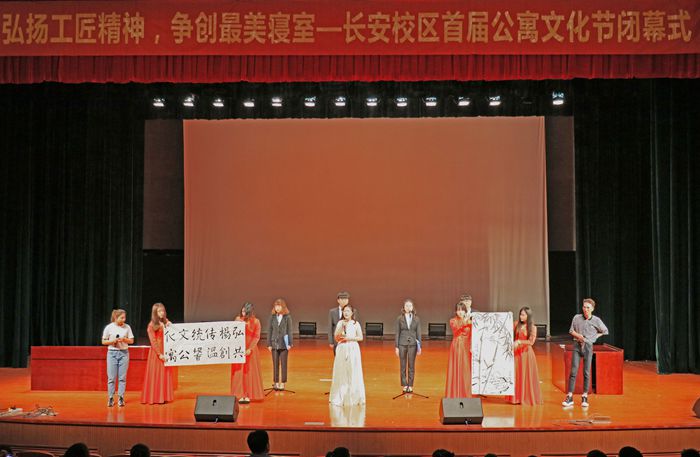 为加强公寓文化建设,促进学生公寓文化育人功能,提升学生文化品位,将素质教育融入学生日常生活中,努力营造积极向上、舒适优雅、文明礼貌、安全和谐的寝室文化氛围,学工部(学生处)开展了为期一个月的长安校区首届公寓文化节系列活动,本届公寓文化节以“弘扬工匠精神 争创最美寝室”为主题,先后开展了寝室安全知识竞赛、“匠心独具”书法、剪纸比赛、“我最喜欢的宿管阿姨”评比、“我爱我家”寝室美化大赛等公寓主题活动,极大的丰富了学生公寓文化生活,提升寝室成员凝聚力及创造力,营造了安全、和谐、文明、健康的寝室生活环境。4月18日晚,公寓文化节闭幕式于长安校区剧场顺利举行,标志着本届公寓文化节圆满落幕。学院副院长张耀老师,学工部副部长温长胜老师,学院督导处陈如娜以及学工部相关负责老师出席了本次闭幕式。 本次闭幕式以文艺晚会的形式,将活动获奖表彰与文艺节目表演相结合,同学们积极参与,表演了各类寝室主题节目,机械技术系李济成等同学以室友谈恋爱为主题,上演小品《要爱,更要兄弟!》,呼吁同学们要树立正确的恋爱观,同时更应该珍惜室友之间的宝贵友情;电子1611班沈杭涛等同学在台上分享了他的《感人寝室故事》,讲述了他在腿摔断后的那段时间,室友坚持每天给他带饭,背他上下楼梯的感人故事,引起在场观众的共鸣;另外还有诗歌朗诵《友谊天长地久》,古典舞《雅韵华章》等节目,体现了同学们珍惜室友情谊、弘扬传统文化的美好愿景。闭幕式最后对公寓文化节期间获奖的同学进行了颁奖表彰。 本届公寓文化节旨在团结同学,促进寝室成员间的交流合作,公寓文化节闭幕式体现我院学生积极向上、多才多艺、团结互助的精神面貌,展现了充实而又丰富多彩的公寓文化生活。我校长安校区将继续做好改善公寓文化环境、加强安全监督等相关工作,充分发挥公寓文化育人的功能,落实学校有关部门的要求,让学院莘莘学子在良好的公寓氛围中健康成长。