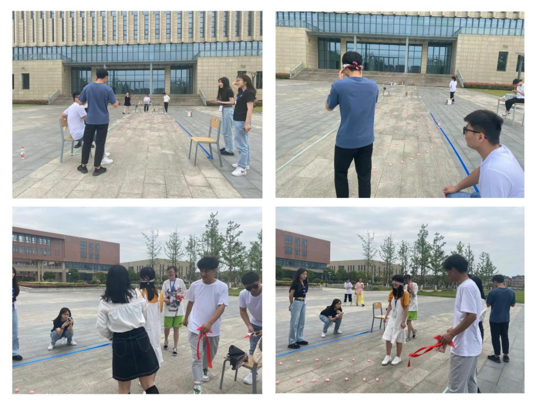 第三个关卡:“会宁”——革命根据地。每个参赛小组选择一名队员蒙上眼睛,通过现场队友指挥来到达终点。此关卡活动使同学们更加明白团队合作的重要性,让同学们了解到党在革命根据地建设中的重重阻碍,以及凝聚力量的重要意义。
