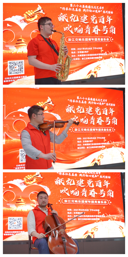 为纪念“五四运动”,庆祝建党一百周年,引导和教育青年团员继承和弘扬“爱国、进步、民主、科学”的“五四精神”,2021年4月28日晚,校团委邀请浙江交响乐团的青年团员演奏家们,在滨江校区5号楼6号厅为我校师生带来了一场以“献礼建党百年,吹响青春号角”为主题的音乐会。本次活动由校团委主办,我校大学生艺术团天籁凌云管乐团、校内音乐爱好者两百余人汇聚一堂,聆听青年演奏家们的精彩表演。