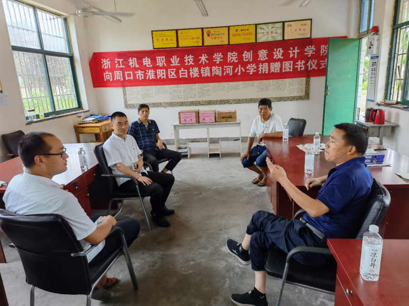 活动中白楼镇中心校党支部副书记、副校长曾祥军首先对我校不远千里来到水城淮阳进行图书捐赠活动表示感谢,并对陶河小学做了简要的介绍。陶河小学现有义务教育阶段学生60余名、教工10余名,陶河小学的孩子们基本上都是村里的留守儿童,他们的父母远赴外地打工,受家庭等多方面条件所限,课外读物相对较少。今天浙江机电职业技术学院创意设计学院在中国共产党成立100周年之际,带来100本课外读物,这不仅仅是雪中送炭,为孩子们个人眼界的拓展、知识的增加带来很大的帮助,同时也是把党的恩情深深镌刻在孩子们幼小的心灵上。