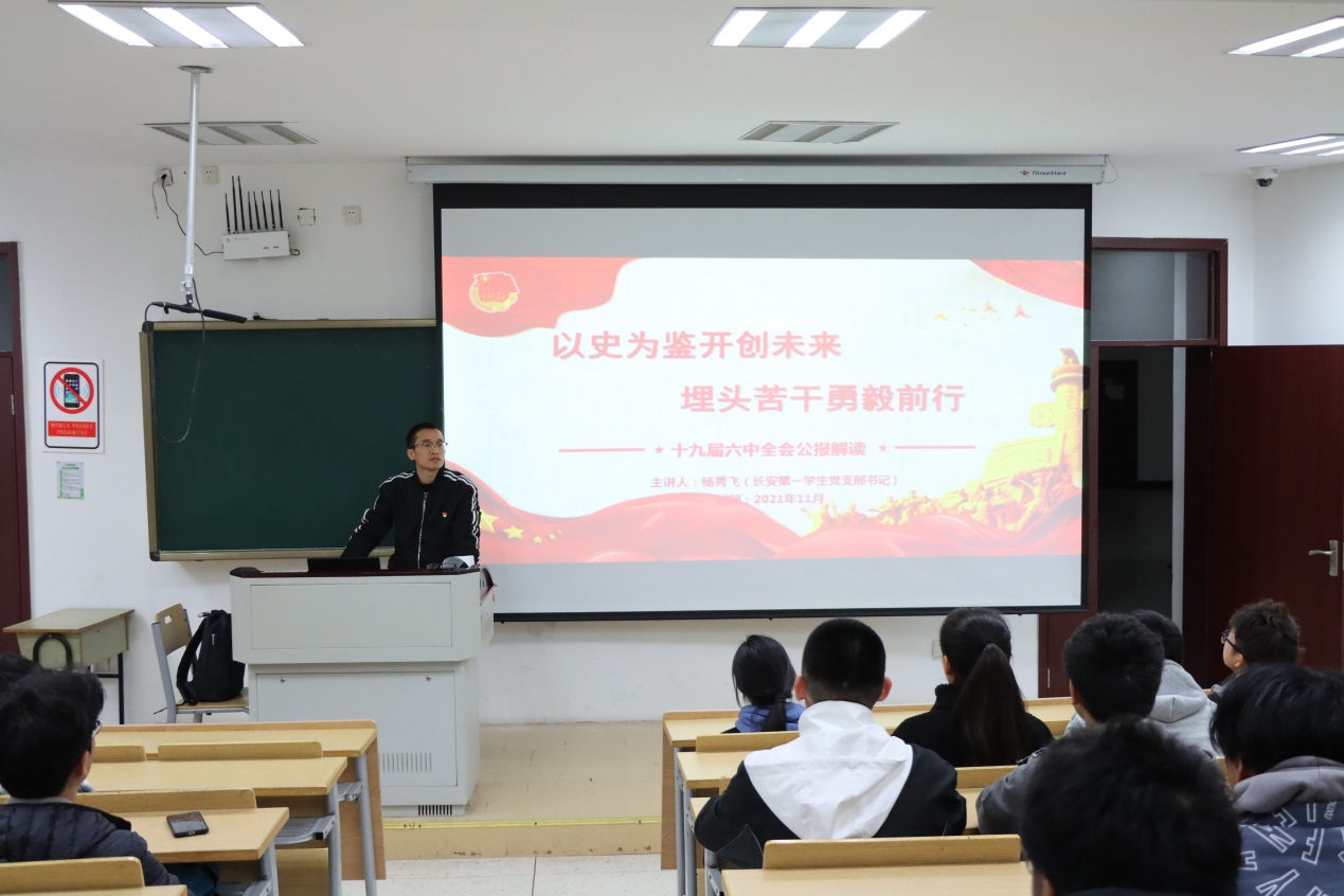 11月25日,长安第一学生党支部书记兼辅导员杨秀飞对学院192名2021级入党申请人开展了题为“从全会公报看党的高分答卷”的十九届六中全会精神宣讲,并对所有入党申请人提出要求。