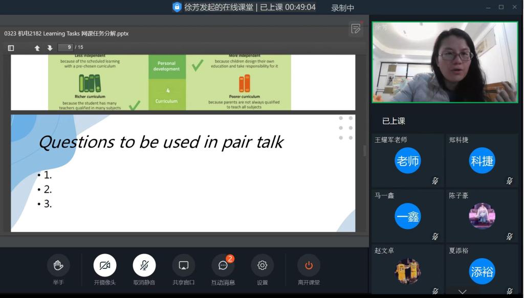 中澳英语教研室组织开展了“听、学、研”线上公开课,阮丹老师把一堂原本普通的《基础英语II》线上课,变成了一次老师们学习探索高效网络课堂的实践课。此次公开课的授课对象为国贸2183班40名学生。学院领导班子与10余名英语教师参加了此次线上公开课。全体观摩老师的实时品评,共同探讨不同平台的使用方法和优缺点。直播课实现了师生语音和文字的充分互动,在传授学生知识的同时,适时地给学生布置在线任务。这样的互动方式既充分调动了学生的学习积极性,也能提升学生的英语书面和口头表达能力。
