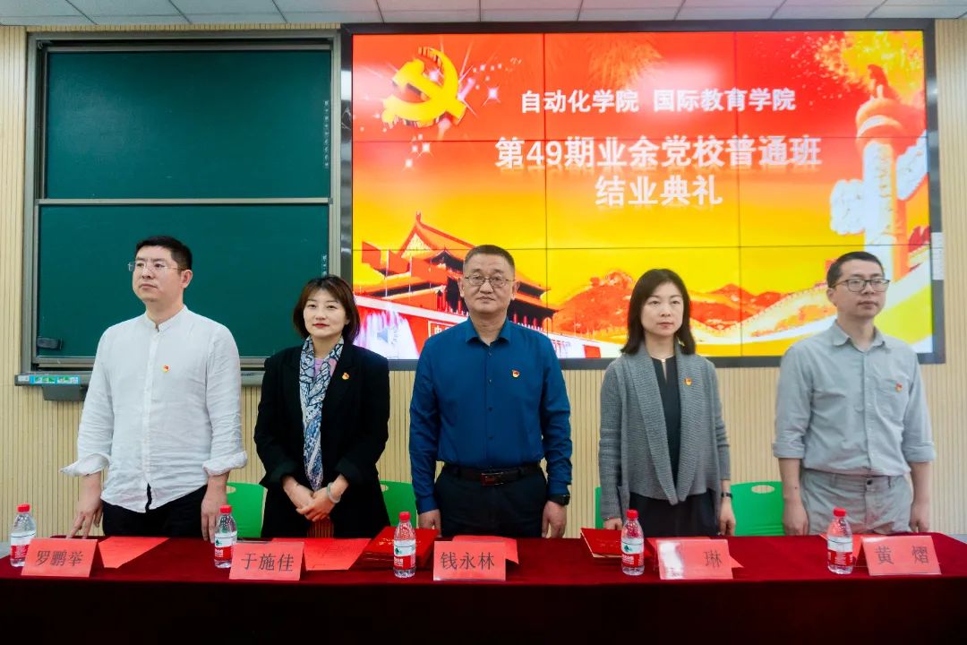 5月3日下午,自动化学院、国际教育学院联合开展的第49期业余党校普通班在6号楼扇形教室迎来了结业典礼。自动化学院党总支书记钱永林、国际教育学院党总支书记周琳、自动化学院党总支副书记于施佳、国际教育学院学生党支部书记黄熠、自动化学院电气自动化学生党支部书记罗鹏举以及自动化学院、国际教育学院全体业余党校学员参加了此次典礼。本次典礼由电气自动化学生党支部书记罗鹏举老师主持。