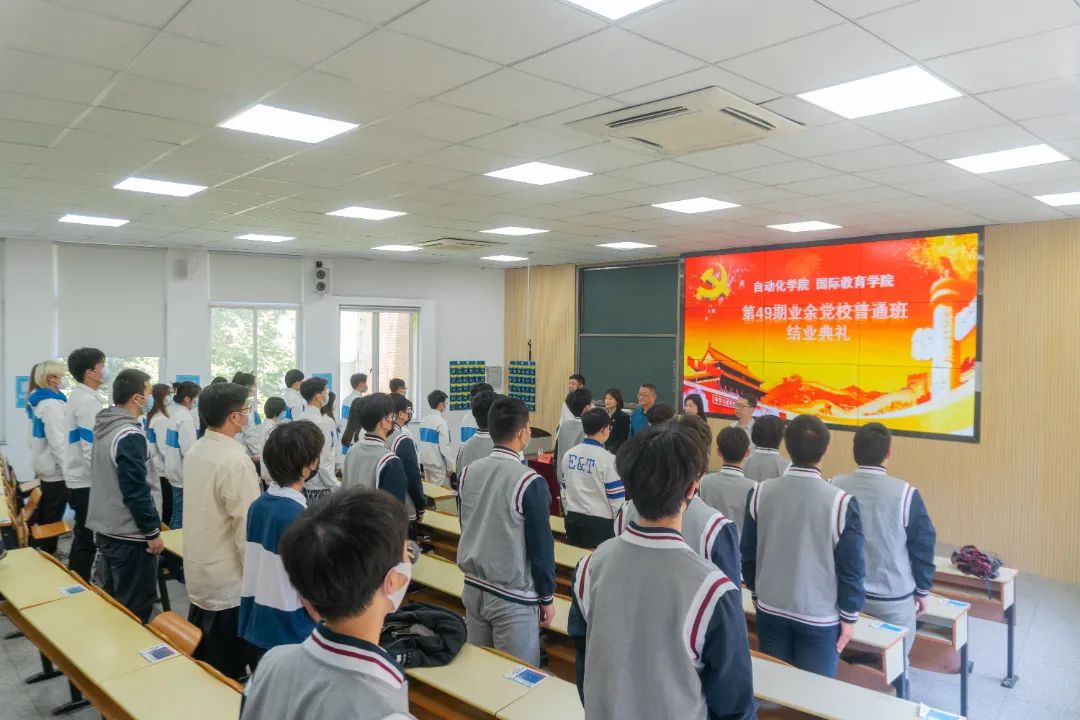 本期业余党校学习制度健全,课堂纪律严明,成绩考核全面,学习课程丰富,包括5次理论课、1次实践课。经过为期7周紧张周密的学习和实践,黄熠老师宣布了第49期业余党校普通班结业学员名单,自动化学院共26名学员结业,国际教育学院共21名学员结业。于施佳副书记宣布了本期业余党校优秀学员名单,其中自动化学院3名,国际教育学院2名。学员有序上台,钱永林老师、周琳老师向优秀学员颁发荣誉证书。