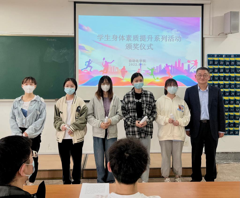 为贯彻落实《中共中央国务院关于加强青少年体育增强青少年体质的意见》(简称中央7号文件),根据学校“增强体质,掌握技能,培育习惯,塑造人格”的目标及“强体健魄、树我邦国”的体育精神,进一步提高自动化学院学生体质健康水平,5月11日下午,自动化学院“学生身体素质提升”系列活动表彰大会在13号楼416举行。学院党总支书记钱永林、学工办主任罗鹏举、辅导员庞万兴、占林军、谢钟涛出席了本次会议。