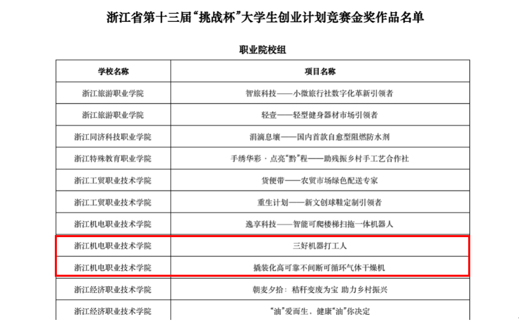 5月21日,在由共青团浙江省委员会、浙江省教育厅、浙江省科学技术协会和浙江省学生联合会主办的浙江省第十三届“挑战杯”大学生创业计划竞赛中,我院《三好机器打工人》和《撬装化高可靠不间断可循环气体干燥机》两个项目获得金奖。