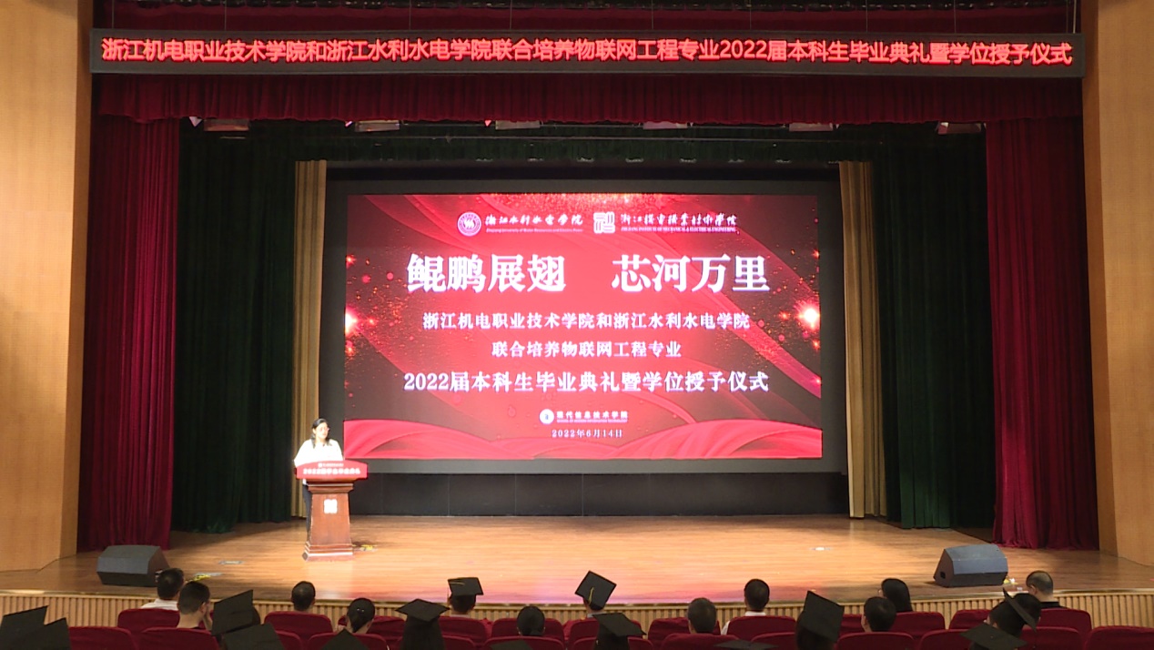 6月14日下午,浙江机电职业技术学院和浙江水利水电学院联合培养物联网工程专业2022届本科生毕业典礼暨学位授予仪式在滨江校区5号楼报告厅隆重举行。浙江水利水电学院信息工程学院执行院长王军、我校现代信息技术学院院长卢涤非,党总支书记、副院长任峰出席仪式。教师代表、物联2061班全体毕业生参加,仪式由现代信息技术学院副院长王芳主持。