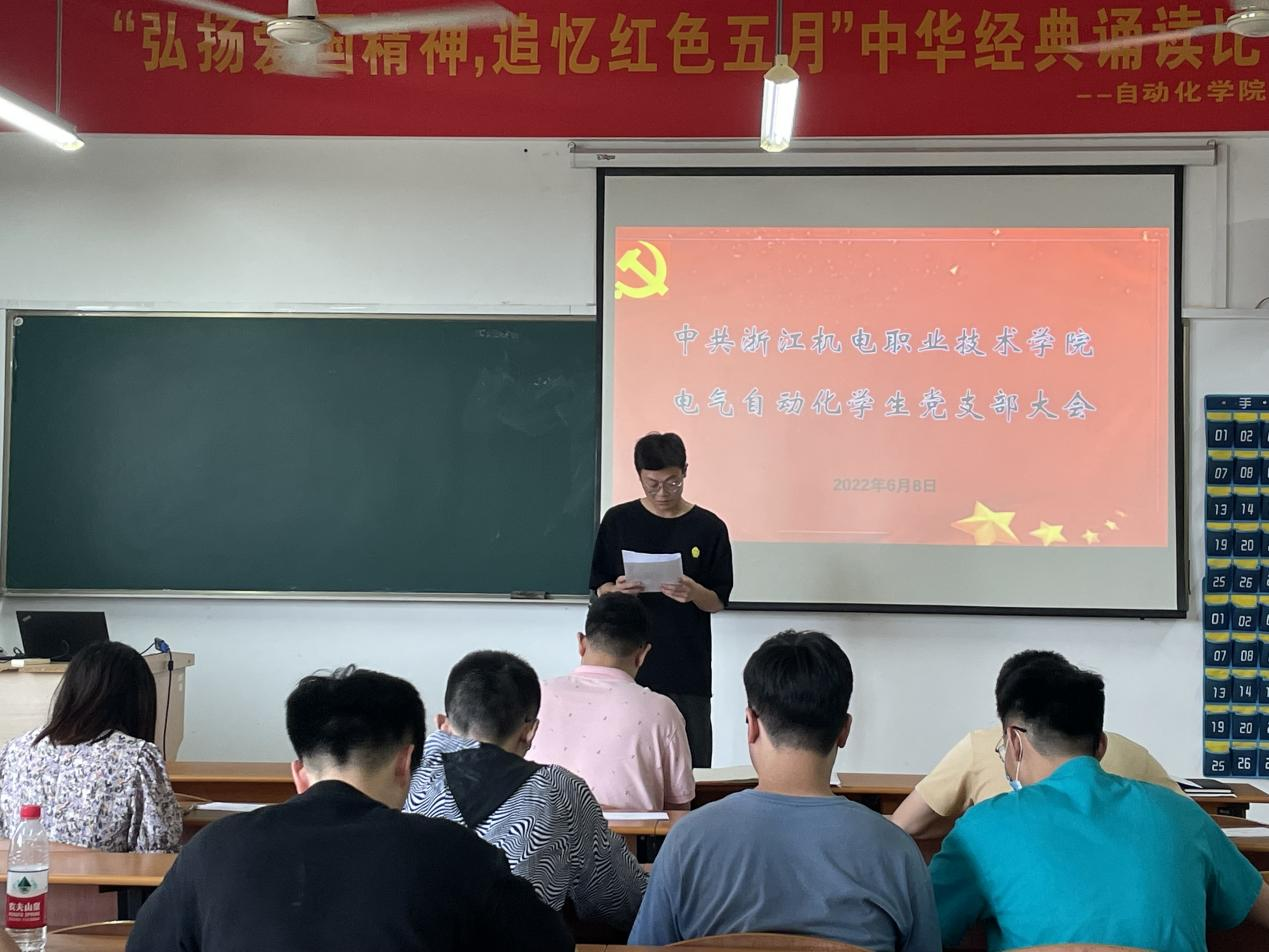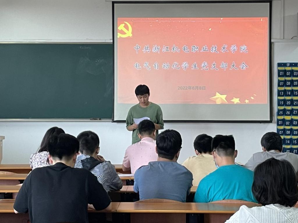 为响应党的号召,培养优秀党员,增强支部凝聚力,2022年6月8日13时,自动化学院电气自动化学生党支部在13-416召开中共浙江机电职业技术学院电气自动化学生党支部大会暨主题党日活动。会议讨论关于吸收张浩迪、陈雯、郑温瑜等10名同志为中共预备党员事宜,并学习了习近平总书记致首届大国工匠创新交流大会的贺信等主题内容。本次会议由电气自动化学生党支部书记罗鹏举主持,学生党支部党员教师、全体学生正式党员、学生预备党员和发展对象参加会议。