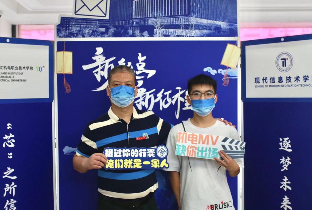 “芯”口罩,“芯”标语,“芯”展板,“芯”纪念等 “花样百出”的新做法营造起仪式感满满的“芯”氛围。学院助理班主任、志愿者等化身“‘芯’志愿团队”,发挥朋辈力量,助力新生报到的各个环节。他们装饰迎新纪念展位,导引解答报到程序,风雨中搬运行李,宿舍楼内服务同学……展示信息风采,传递信息精神。现代信息技术学院新生杜蒙杰同学来到“芯”纪念区拍照留念,作为全校最高分录取的新生,他希望与所有同学一样,今日启航向未来,回首无悔致青春。