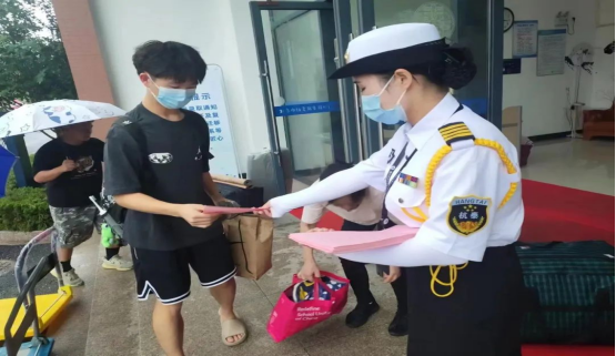台风、雨水给迎新工作带来了很多困难,但保卫处全体工作人员始终坚守岗位,毫无怨言的做着各项工作:指挥交通、法制宣讲、帮助新生搬运行李、疫情防控等,热情服务为报到新生和家长排忧解难。