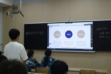 交流会开始前,各班负责人向新生介绍了两位优秀学长的个人风采。随后在同学们的期盼目光下,两位校友分别围绕学业问题、创新创业、职业生涯规划、综合能力培养等多方面与新生展开交流,鼓励大学生在校期间要掌握好专业技能,积极参与二课堂活动,提升自身综合素质。
