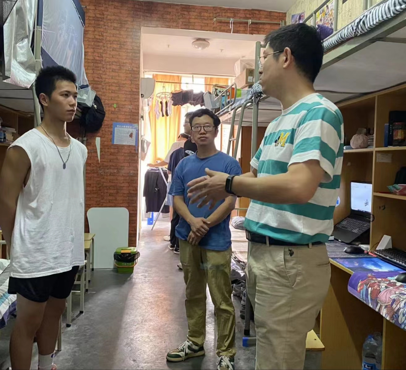 罗书记特别关注学生干部寝室内务整理情况,他指出:身为学生干部,要以身作则,在寝室内务以及各个方面都要做同学们的榜样。同时,罗书记也对全体同学提出几点要求:一、同学们在寝室保持卫生干净整洁,营造良好生活环境,勤洗衣物,避免异味。二、全体同学要有主人翁意识,要有高度的责任意识,严格执行学校寝室管理制度,遵守作息制度,以更饱满的精神状态为学习提供保障,只有休息好才能学习好。三、同学们要有规划意识,对寝室内务和自己的人生要有自己规划,多向身边的优秀的同学学习。四、注意寝室用电安全,杜绝使用大功率电器。五、秋季来临,气候多变,注意做好病毒防护,及时增添衣物。六、加强户外锻炼,提高身体免疫力。