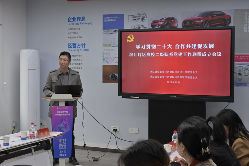 为深入学习宣传贯彻党的二十大精神,全面贯彻党的教育方针,落实立德树人根本任务,坚持为党育人、为国育才,创新基层党建工作载体,促进高校基层党建互学互鉴,经各相关高校二级院系党组织联合倡议,成立滨江片区高校二级院系党建工作联盟。10月28日成立大会在我校举行。本次会议由学校创意设计学院与浙江商业职业技术学院经济管理学院联合承办。滨江片区高校浙江中医药大学组织部,浙江大学城市学院信息电气工程院党委、浙江旅游职业学院酒店管理学院等14所高校的二级院系党组织负责人、党务干部参加会议。