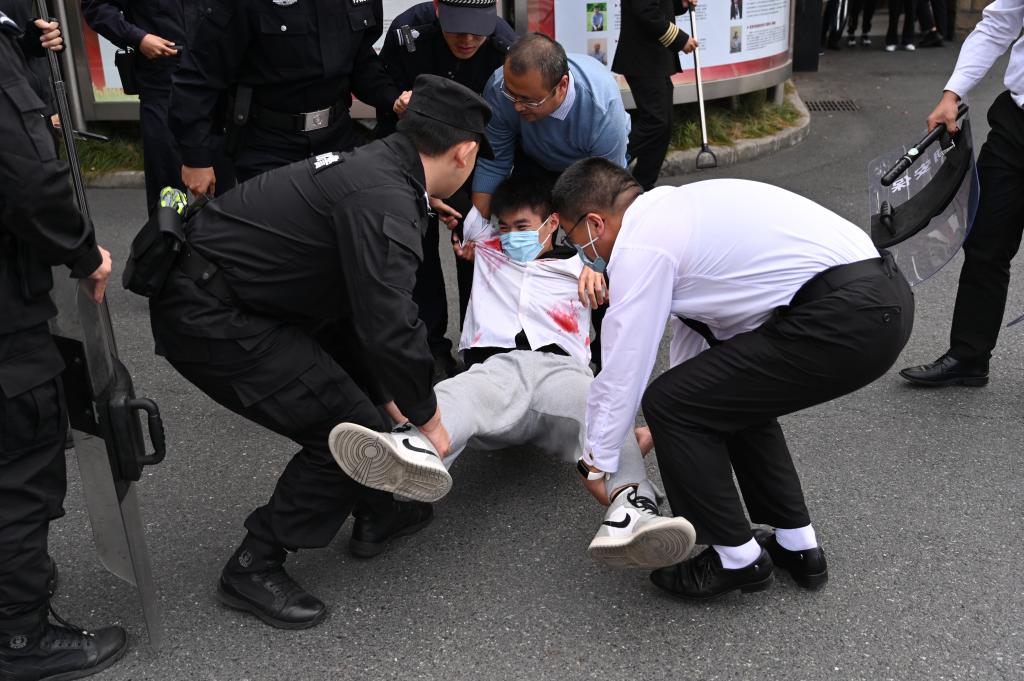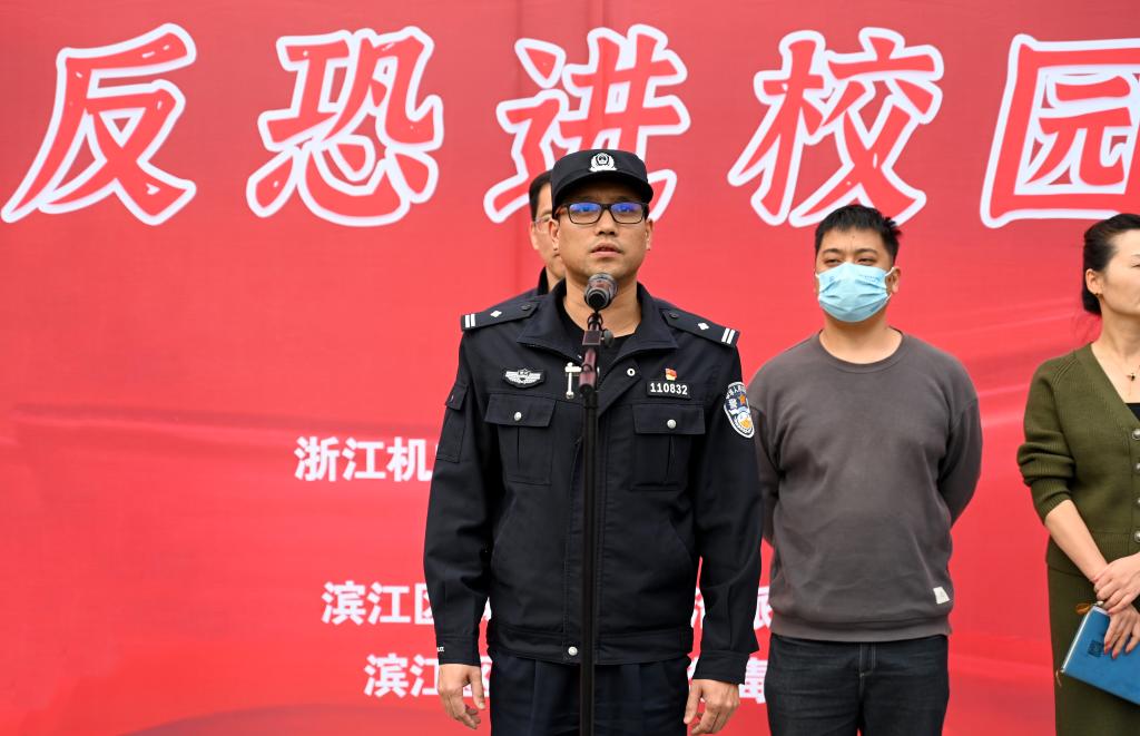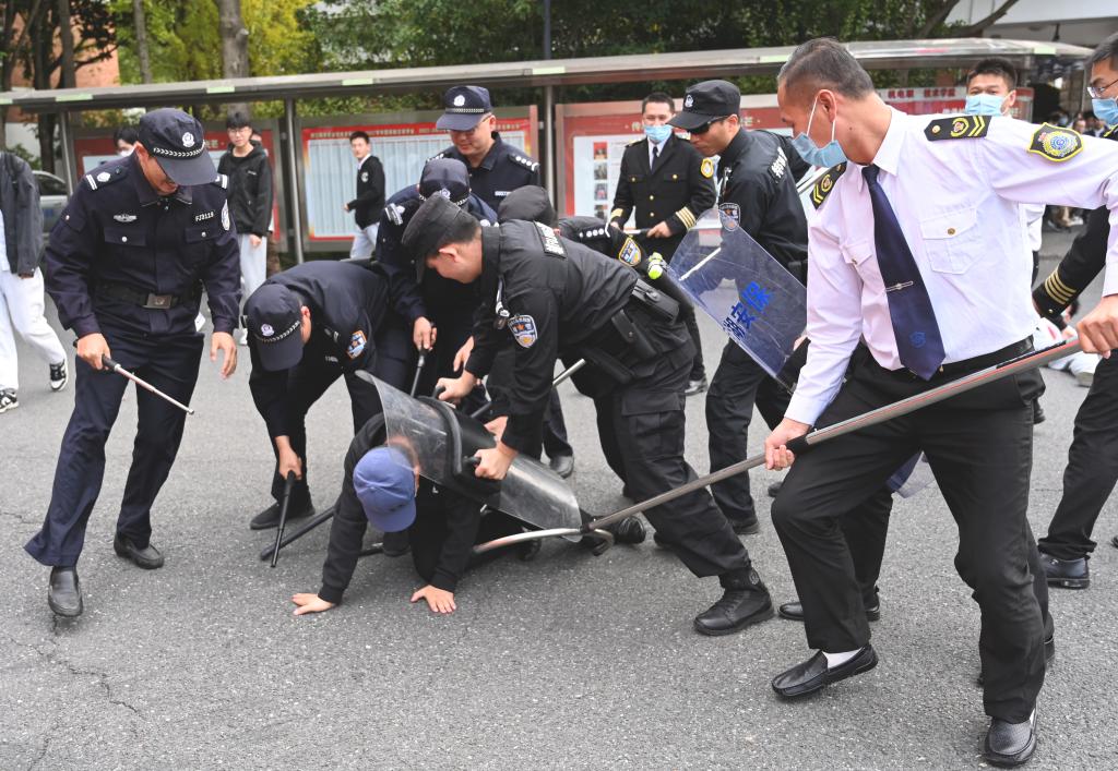 滨江校区首先开展的反恐演习由浦沿派出所民警徐小兵主持,演习模拟了三个场景,一是模拟“暴徒”强行闯入校园,门岗保安果断制止并与其周旋,随即启动防暴反恐应急预案,保安队员利用钢叉、防暴盾、警棍等专用防卫器械作制伏“暴徒”,并将嫌疑人移交民警带回公安机关。二是模拟歹徒持器械伤害人质,校园安保人员发现后立即启动反恐防暴应急预案,将歹徒成功制伏并移交公安机关,同时医务人员积极救治受伤人质。三是一名精神异常人员在校园中企图自焚,校卫队员立即通知校园110指挥中心,迅速用对讲机请求现场支援,应急防暴组人员合力制服歹徒,扑灭现场火苗,将其带离校园。