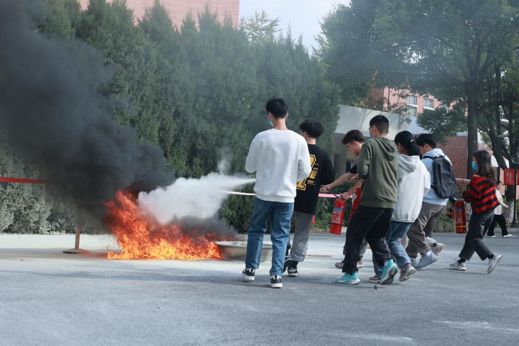 海宁校区消防演练现场,教学楼烟气浓密,警报声响彻校区,师生们在学校安保人员的疏散引导下,弓身沿着疏散指示通道跑出,在最快的时间内有序地从教室撤离到安全地带。医疗救援、消防人员、校安保人员快速反应,个个训练有素,组织灭火救援和疏散演练工作顺利完成。