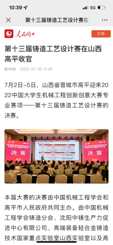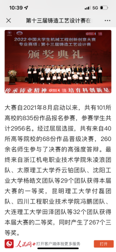 在2022中国大学生机械工程创新创意大赛专业赛项—第十三届铸造工艺设计赛中,由我校增材制造学院老师巫红燕、王伟春和陈凯敏指导的朱凌浪、叶仪挺、李嘉俊等3个团队,与本科生同台竞技,层层闯关,最终取得3个国赛一等奖的优异成绩。可喜的是,其中两组分别位列一等奖的1、2名。人民网在专题报道中因此突出了我校的获奖信息。