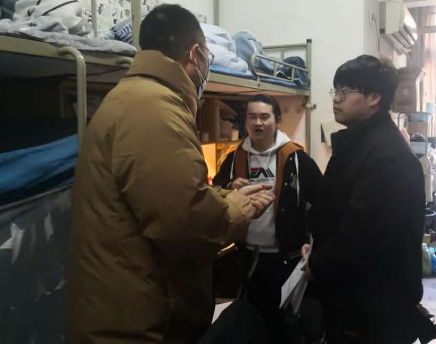 在走访过程中,汪书记亲切地与同学们交谈,了解了学生线上听课的具体情况,希望同学们能适应线上上课的情况,优化时间安排,高质量完成线上学习任务,在疫情的形式下也要注意个人和寝室的卫生,保持宿舍通风,并叮嘱同学们做好个人防护,加强体育锻炼,提高身体素质,有问题向班长和班主任反馈。与此同时,汪书记检查了寝室的内务卫生,排查了寝室各种安全隐患,提醒同学们在疫情期间不要放松警惕,注意个人的身体状况和心理健康,确保校园防疫防范工作不懈怠,加强安全防范意识,谨防电信网络诈骗。