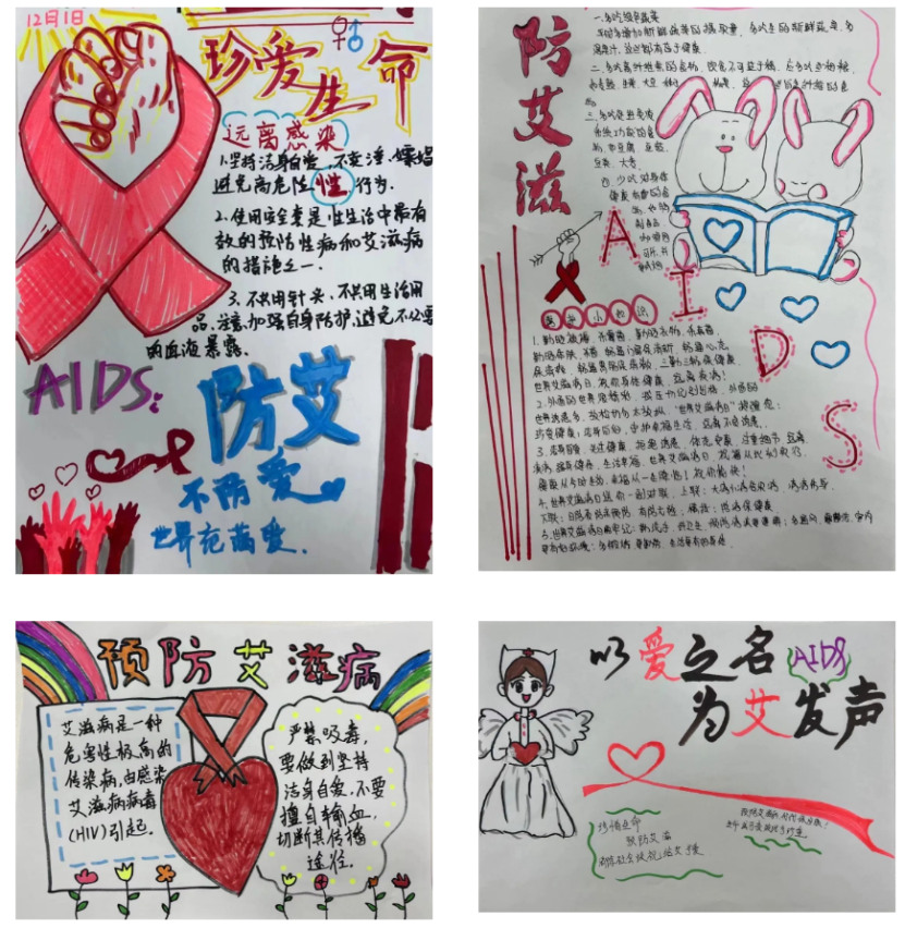 活动中同学们认真的用画笔在白纸上尽情发挥自己的想象,围绕“防艾滋”为主题,创作自己心中的防艾滋手抄报,手抄报虽然各不相同,但都突出了艾滋病基本知识、传播途径、流行趋势,艾滋病对自己、家庭、社会的危害及如何有效防控等内容。