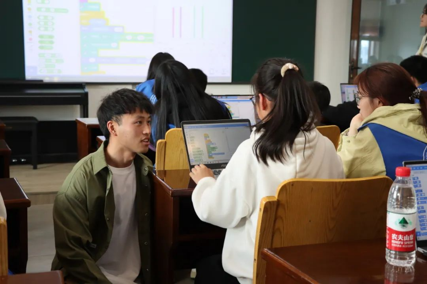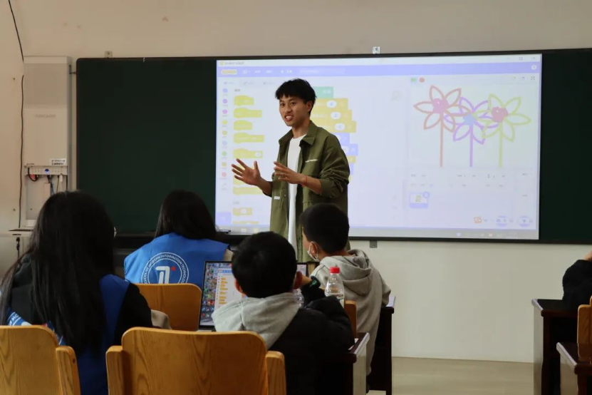 编程课堂生动有趣,志愿者通常采用互动模式进行教学。在知识讲授过程中,把大问题不断分割成小问题,同时通过合理安排代码编程实践,完成了许多小游戏作品制作。Scratch编程教学不仅可以让小朋友们掌握编程技能,而且还培养了他们的数学逻辑思维能力和分析解决问题的能力,更在他们心中埋下“数字中国”的种子。