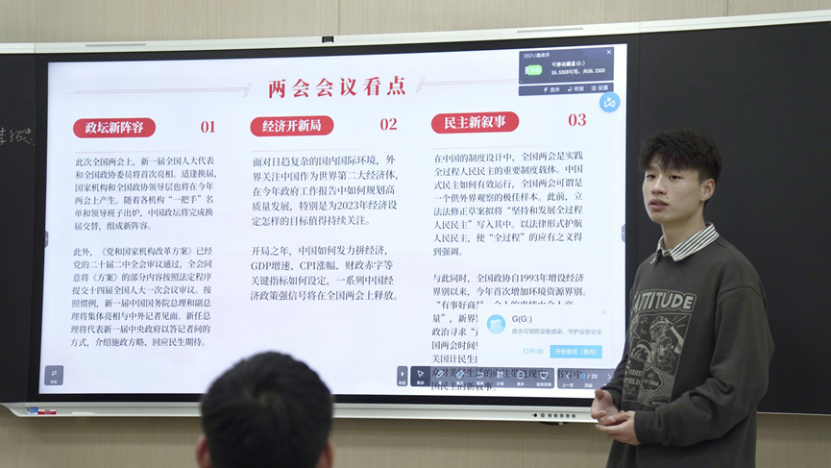 2023年全国两会是党的二十大后召开的第一次全国两会,对于全面贯彻党的二十大精神,实现全面建设社会主义现代化国家顺利开局起步,具有十分重要的意义。为了进一步学习全国两会精神,鼓励大学生关注社会热点,引导青年学生将思想和行动统一到全国两会精神上。2023年4月12日,现代信息技术学院通过“榜样引领前行”宣讲的形式,推动全国两会精神在师生中走深走实、入脑入心,引导同学们将两会精神与理想信念、专业学习、成长成才相互结合起来。