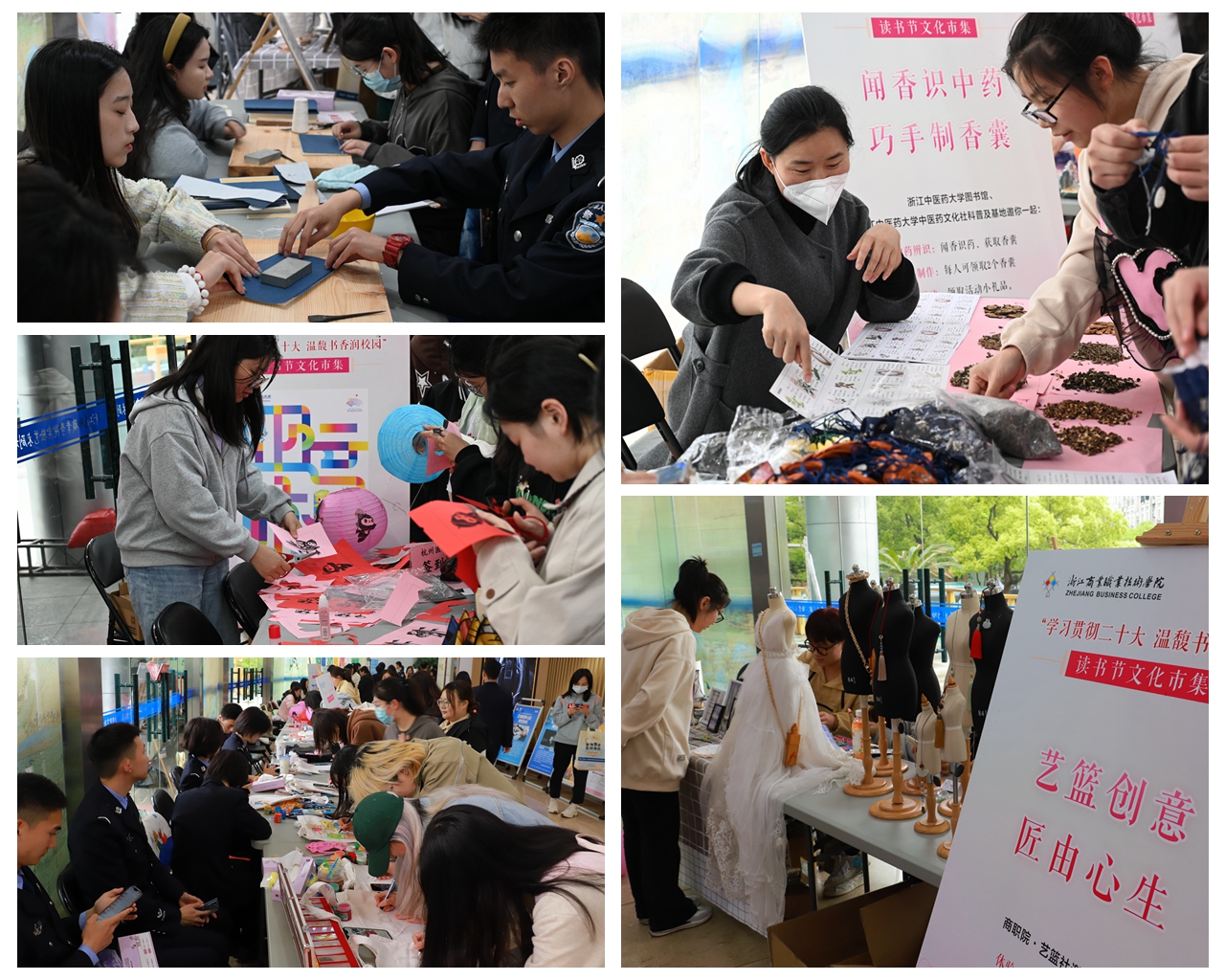 此次活动,滨江高校纷纷拿出“看家本领”:浙江中医药大学图书馆“闻香识中药,巧手制香囊”摊位制作手工香囊,锦袋精美,药香沁脾;浙江警察学院图书馆“团结奋进迎亚运 藏蓝青春铸警魂”摊位开展禁毒、防诈骗宣传,绘制创意帆布袋;杭州医学院图书馆“璀璨灯光,共绘亚运”摊位制作手工灯笼,荧荧灯火,心心相融;浙江艺术职业学院图书信息中心“教你做一本线装书”摊位体验古籍装帧,鲜活古籍,体悟文化;浙江商业职业技术学院图书馆“艺篮创意,匠由心生”摊位制作古风饰品,古朴典雅,素净端庄……