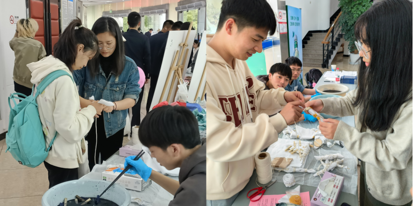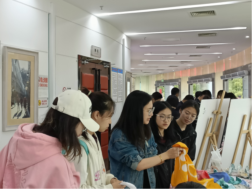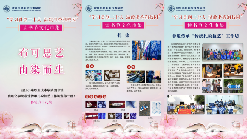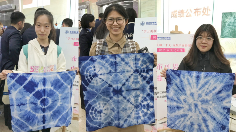 4月23日,值第28个世界读书日之际,滨江六所高校图书馆联合举办了“学习贯彻二十大温馥书香润校园”读书节活动,自动化学院非遗传承“传统扎染技艺”工作坊联合学校图书馆在读书节文化市集上推出扎染方巾制作活动,现场吸引了各高校百余名学生参加,充分宣传和发扬了传统扎染艺术,使学生在感知历史文化与艺术的过程中,进一步增强文化自觉和文化自信。