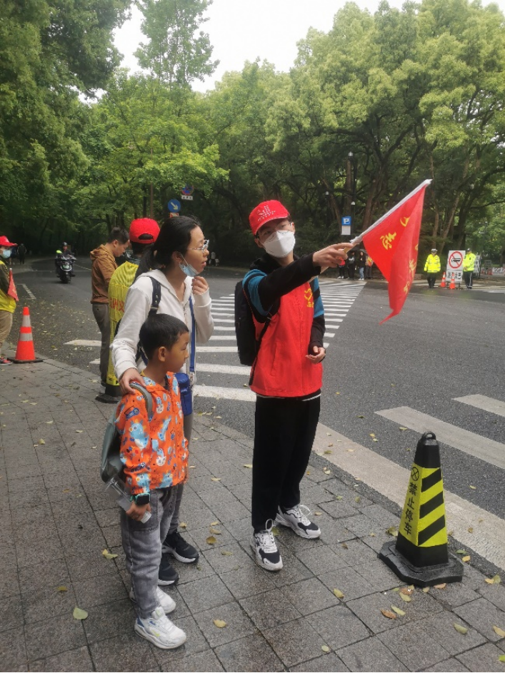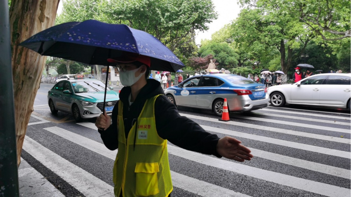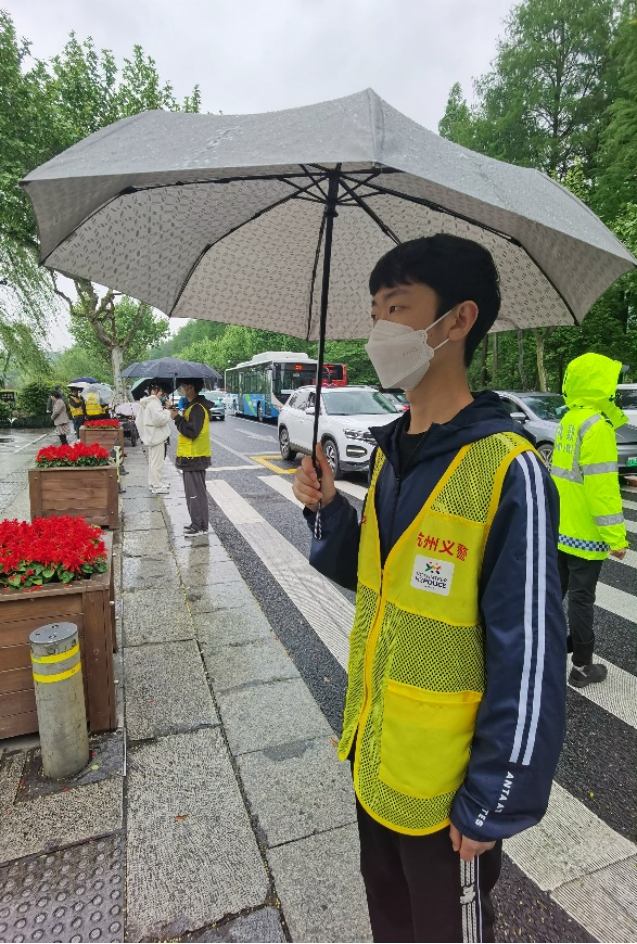 假日清晨,志愿者们来到西湖景区,在杭州市公安局虎跑中队和南山中队的指引下,分别部署在虎跑路三台山路口、南山路苏堤南口、南山路太子湾三个人流密集的点位。他们身穿“杭州义警”黄色马甲,手持红色旗帜,头戴小红帽,协助交警进行文明交通引导。尽管下起了雨,但文明服务不松懈,志愿者们坚守岗位,站在十字路口人行斑马线处,协助交警耐心地引导行人和非机动车遵守交通信号灯有序通行,礼貌地劝阻行人和非机动车闯红灯、越线、走机动车道等不文明交通行为,耐心解答游客问询为游客提供交通导航服务。每位志愿者都恪尽职守、耐心服务,用自己的实际行动诠释了志愿服务精神。他们在川流不息的人群中俨然成为了路边一道亮丽的风景线,为安全有序的五一旅游环境贡献了青春力量,得到了市民的支持和交警的称赞。