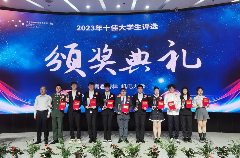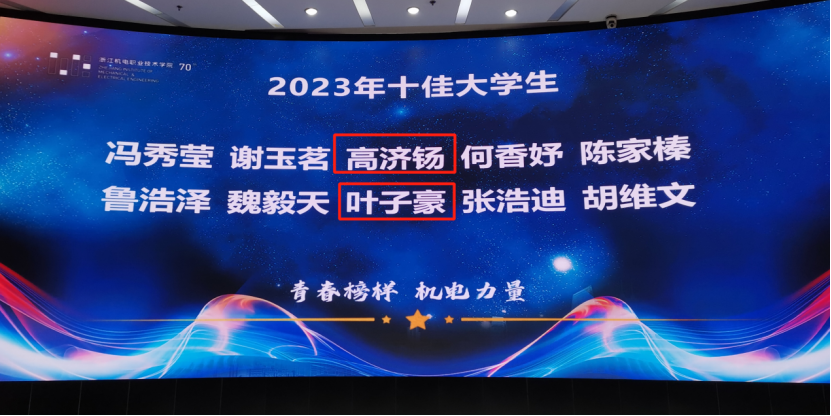 2023年5月5日,浙江机电职业技术学院2023年“十佳大学生”评选活动圆满落下帷幕。创意设计学院工设2001班高济钖、多维2031班叶子豪获评“十佳大学生”。他们现场展示了自己德智体美劳全方面的优秀表现以及在学术研究、学科竞赛、社会实践、社会工作等领域的突出成果,展现了创意设计学子昂扬向上的精神风貌和先进的榜样作用。
