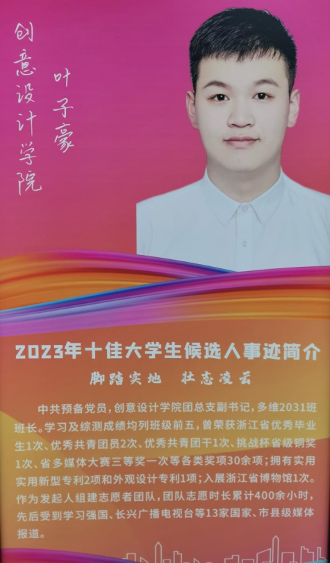 叶子豪,中共预备党员,创意设计学院多维2031班团支书。在校期间,曾任创意设计学院团总支副书记、社团心理部部长、艺术2132班班助等多项学生工作职务。曾获浙江省优秀毕业生1次、优秀共青团员2次、优秀共青团干1次、挑战杯省级铜奖1次、省多媒体大赛三等奖一次、校三等奖学金三次等多项荣誉;拥有1+X职业技能证书、实用实用新型专利2例和外观设计专利1例;个人作品入展浙江省博物馆——“形而上下”龙泉青瓷展。工作认真负责,做事勤恳踏实,积极参加各种志愿者活动,其中2021年曾参与的暑期社会实践活动被学习强国、长兴广播电视台、长兴文明网等13家国家级、市县级媒体争相报道。