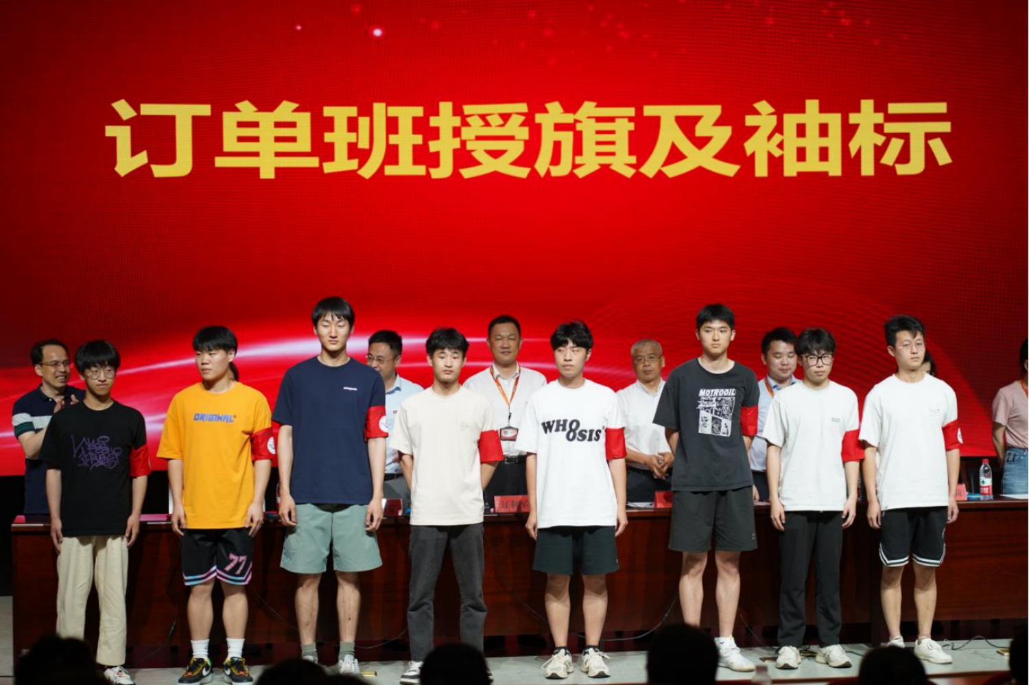 会上,由学校和企业领导为订单班成员订单班授旗和袖标,希望他们在今后的学习和工作中相互帮助、相互扶持、相互学习、共同提高。