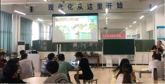 2023年6月6日中午,空中课堂在智能机器人实训室拉开帷幕。通过企业微信平台,俞金妹老师指导的我院电子2101班与傅杰老师指导的阿克苏职业技术学院机械21401班进入了同一个课堂。