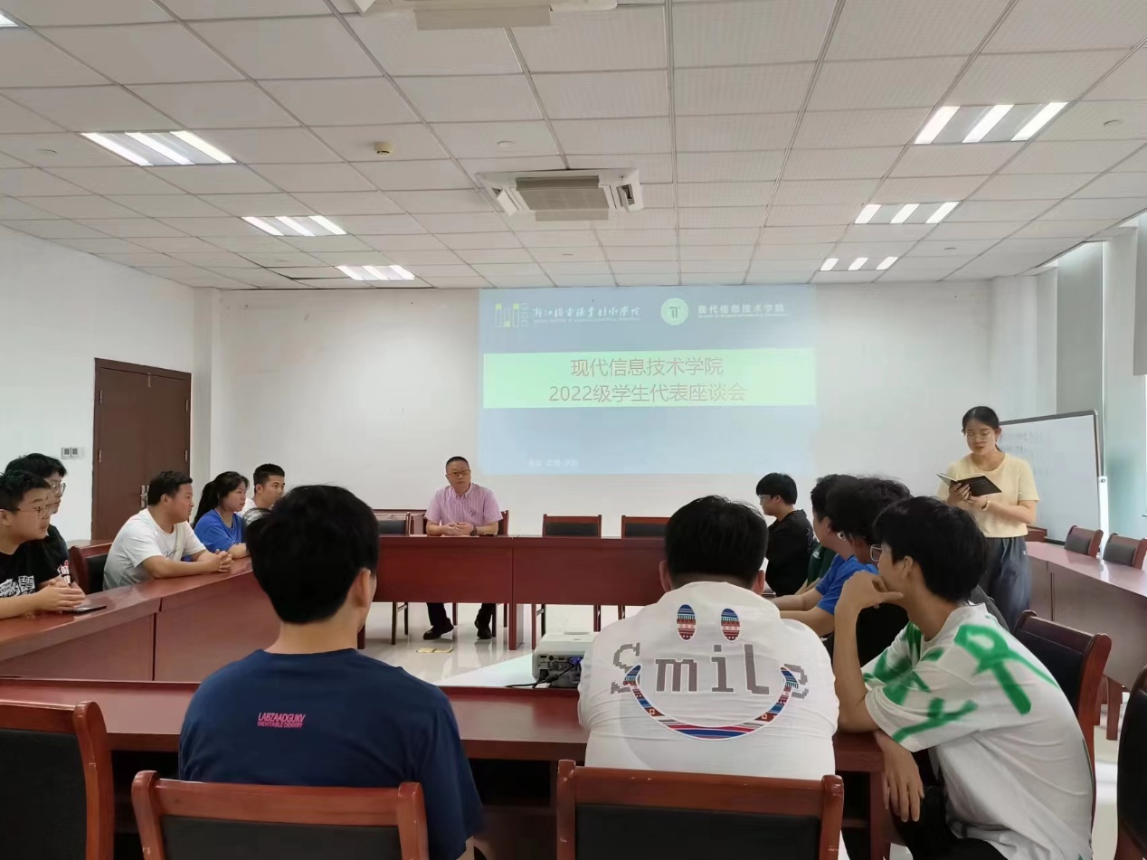 为深入推进学院学习贯彻习近平新时代中国特色社会主义思想主题教育,开展调查研究,扎实做好学生工作,6月6日现代信息技术学院在海宁校区举行主题教育系列学生座谈会,学院党总支书记张荣路出席会议,开展集体谈话、调研活动,辅导员赵玉霞、各班学生代表参加会议。