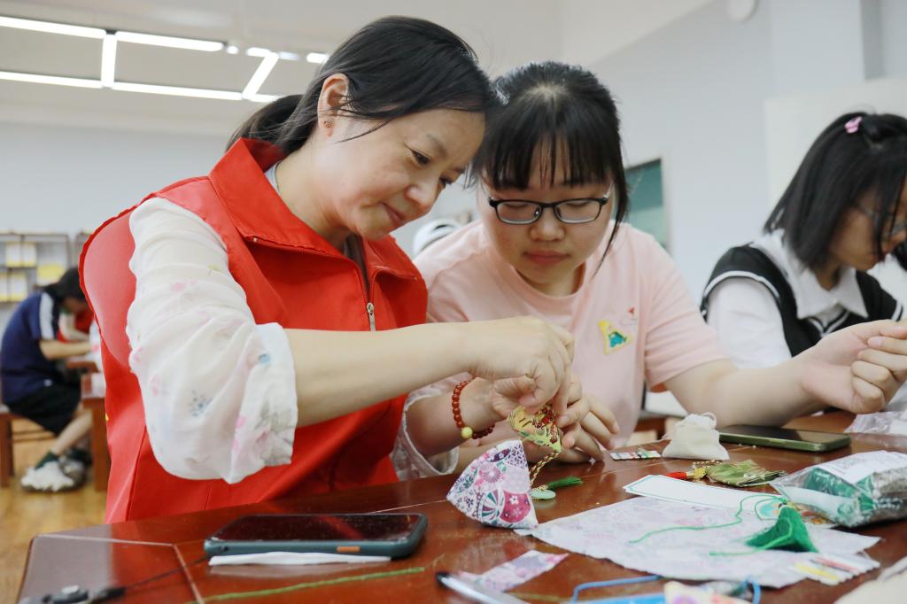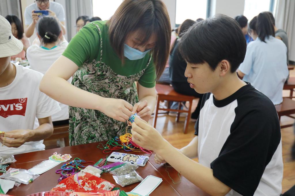 在现场,海宁市中心医院医务工作者们为我校师生普及当地的端午习俗,讲解配置好的中药包的药材,介绍其药性功能,教学香囊的制作方法,并指导师生们编制五彩绳结。活动现场氛围浓厚,同学们悟性很高,在一针一线中,迅速从制作“小白”到“熟练工”,不少同学学会制作了只需要缝一侧边的“简易版”香囊后,又主动要求制作从布料裁选到流苏配置都要手工制作的“进阶高难版”的香囊。