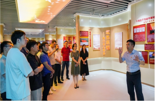 签约仪式后,查广云书记带领浙江省机电设计研究院有限公司一行参观筑牢“红色根脉”主题教育实践基地。查书记从红色信仰、红色历程、红色旗帜、红色沃土、红色基因、红色时空等六大红色板块详细讲解了中国共产党建党百年的理论创新与实践发展成果。马院思政教师代表王平平老师以《推进和拓展中国式现代化》为题,为全体党员讲授党课。
