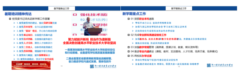 王耀军副院长从学院上半年及暑假所获得的成绩出发,落实省委高教强省战略,结合校党委书记汤兆武暑期主题教育读书会暨中层干部培训会议主题报告精神,立足学校改革攻坚、升本冲刺、双高收官等重点核心任务,围绕“十个聚焦”,以全力争创高水平职业技术大学为目标,梳理了五项学院下半年重点工作。