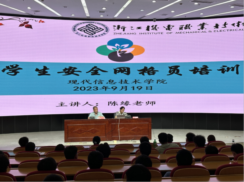为积极打造平安校园,护航亚运,助力学校高质量发展,及时传达学习学校召开的安全稳定工作部署会议精神,部署有关要求,9月19日星期二晚上,现代信息技术学院在综合楼四楼学术报告厅召开了寝室长暨网格员安全培训专题大会。学院党总支副书记朱爱民出席大会,学院全体寝室长(安全网格员)和辅导员老师参加大会。