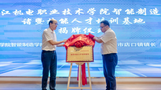 程方启与蔡天军为“浙江机电职业技术学院智能制造学院人才培训基地”揭牌。