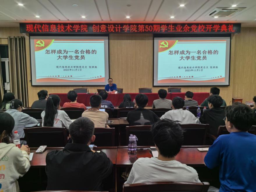 2023年11月1日,现代信息技术学院党总支、创意设计学院党总支第50期学生业余党校开班,旨在学习贯彻习近平新时代中国特色社会主义思想主题教育相关精神,扎实推进“四治四促”作风建设专项行动任务落实,提高学生入党积极分子的思想政治理论素质,助推高质量发展党员。现代信息技术学院党总支书记张荣路,创意设计学院党总支副书记符强、史奕出席开班典礼。开班仪式由现代信息技术学院党总支副书记朱爱民主持,95名业余党校学员参加了此次开学典礼。