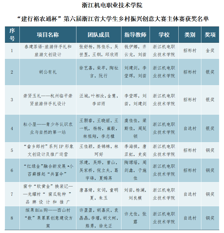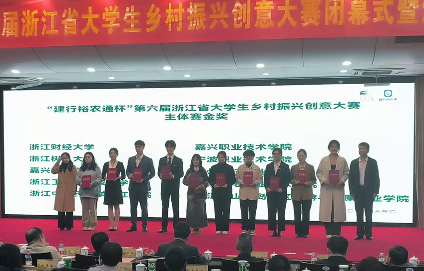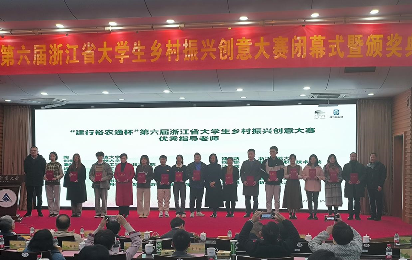 11月14日,由浙江省教育厅、浙江省农业农村厅、浙江省乡村振兴局、浙江省文化和旅游厅指导,浙江省大学生科技竞赛委员会主办,中国计量大学和浙江农林大学共同承办的“建行裕农通杯”第六届浙江省大学生乡村振兴创意大赛主体赛闭幕式及颁奖典礼在中国计量大学顺利落幕。我校“春建茶语”、“耘小屋”等8个项目,获得金奖1项、银奖3项、铜奖4项的佳绩,创意设计学院钱伊娜老师获评“优秀指导老师”。