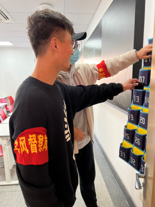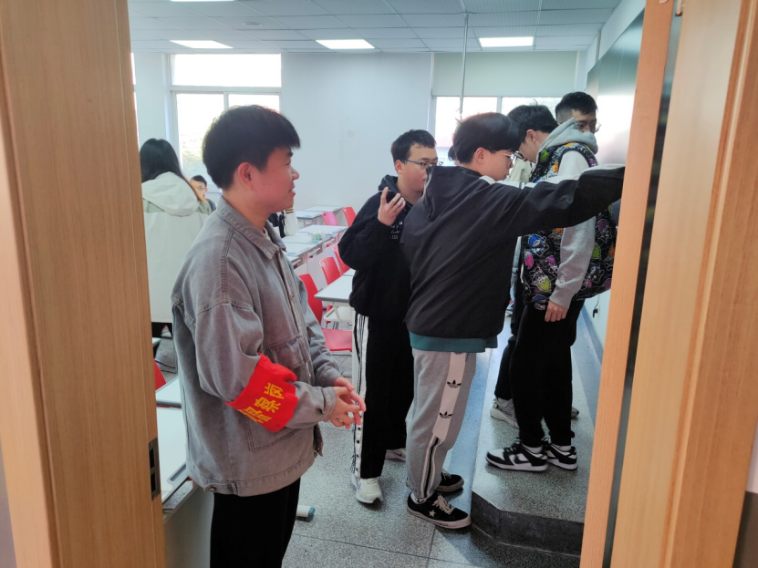自动化学院志愿者们在教学楼下站岗执勤,他们身体力行,坚持早起,像挺拔的松树一般站在门口提醒同学们不迟到不早退,正确佩戴口罩,不带三餐进教学楼。在巡查过程中,志愿者们提醒同学们手机入袋,保持良好的精神状态迎接每一节课。不仅维护了教学楼学习环境的干净整洁,营造了和谐有序的教学环境,更进一步推动了文明校园的创建。