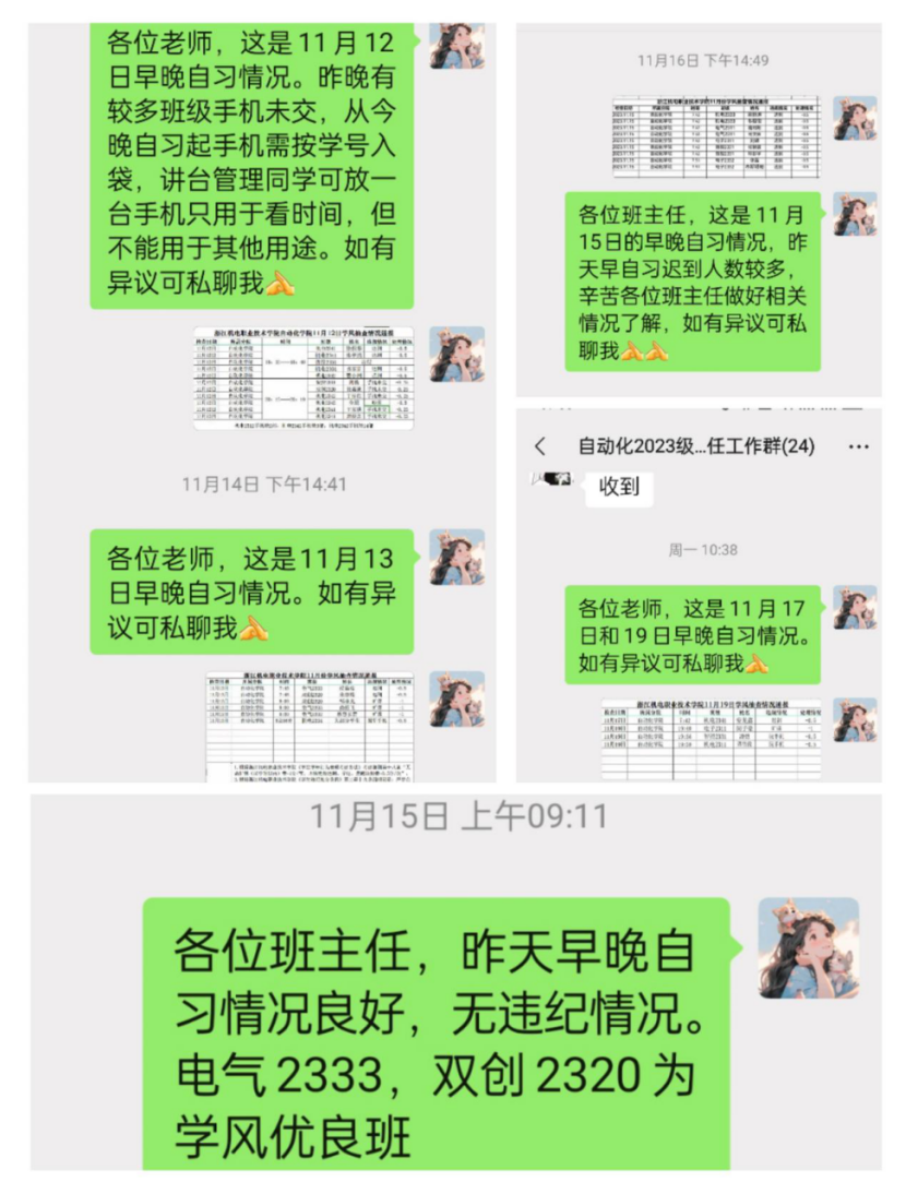 为加强学生的自我管理意识、进一步加强学风建设,在近一个月的学习生活中,我院加强了对大一学生早晚自习出勤情况的管理。为加强学风学纪的建设管理,每个教室都有自律部成员巡查,教室负责人配合检查,班主任、辅导员也积极参与,同学们精神状态良好,认真学习。为帮助学生提高学习效果,培养学生的自主学习能力,加强学生的自律能力,自律部将每天早晚自习出勤检查情况公示于学院公示栏及班主任工作群,督促大家更好地自主学习。