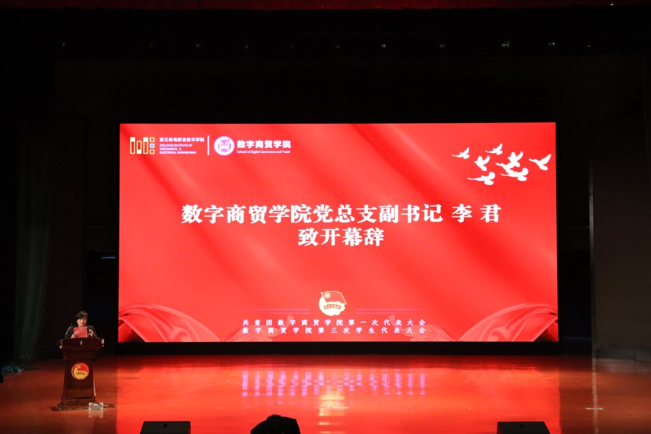 大会在庄严的国歌声中拉开帷幕。数字商贸学院党总支副书记李君致开幕词。她首先代表学院对各级领导和兄弟学院对我院共青团事业的关心和支持表示崇高的敬意和诚挚的感谢,并以大会的名义向长期奋斗在一线为学院共青团事业辛勤付出的第十七届团总支学生会委员、广大团员和青年学子表示亲切的问候和良好的祝愿。李书记指出,学院团总支学生会始终秉承“求实、求精、求新”的校训,坚持以生为本、积极进取的工作思路,团结广大青年学子,在组织建设、思想引领、校园文化、社会实践、社团建设、服务学生、平安校园等方面打下了坚实的基础,在提高学生综合素质、繁荣校园文化、促进学风建设等方面发挥了重要的作用,为学校升本攻坚工作及我院“跨江入海”发展写下了浓墨重彩的一笔!