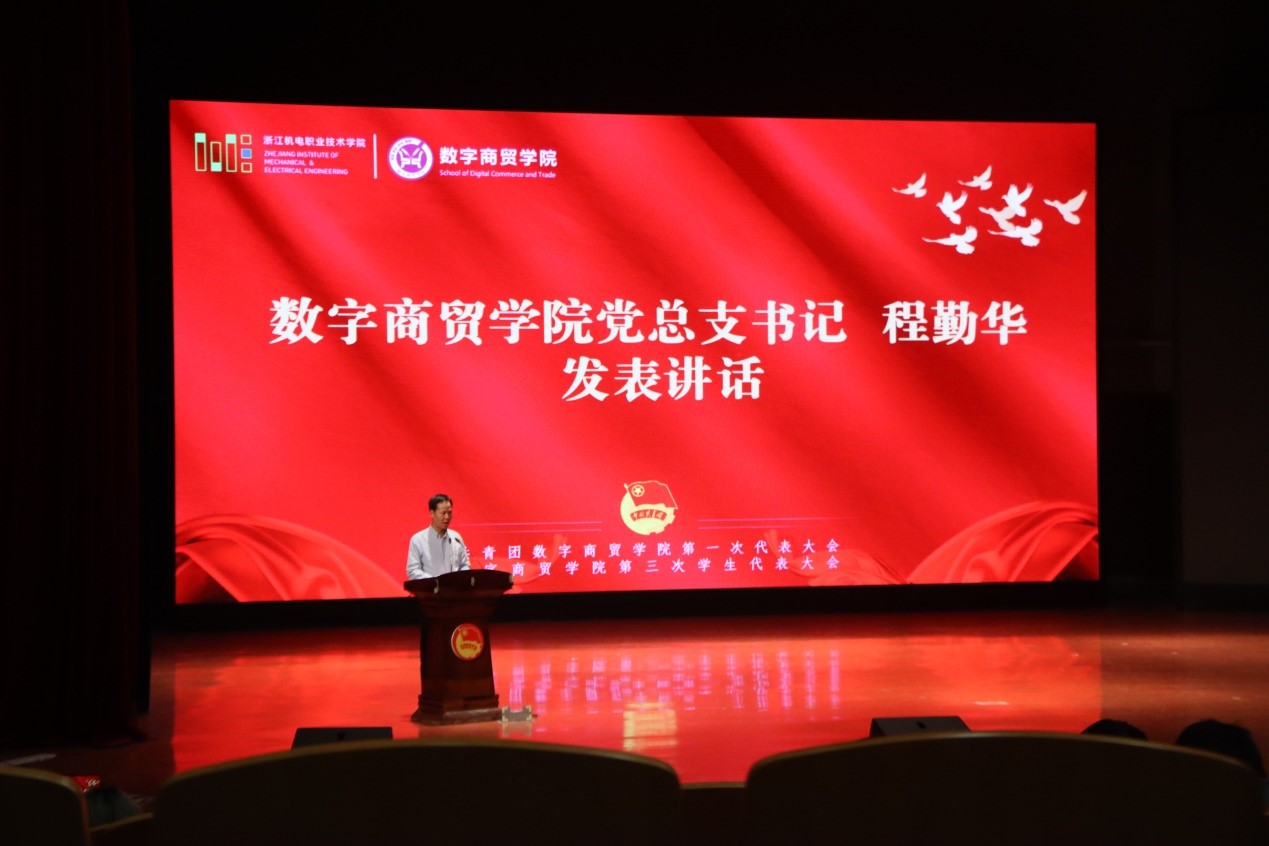 在全校上下扎实推进“四治四促”作风建设专项行动,全面巩固深化学习贯彻习近平新时代中国特色社会主义思想主题教育成果之时,在全体师生齐心协力共迎升本评估工作之际,11月27日晚17:30,共青团数字商贸学院第一次团员代表大会、学院第三次学生代表大会(以下简称“双代会”)在海宁校区小剧场顺利召开,学院党总支书记程勤华、党总支副书记李君、全体辅导员、校学生会主席团主席、兄弟学院团总支学生会主席团代表、学院第十七届团总支学生会委员以及各团支部学生代表共420余人参加本次大会。