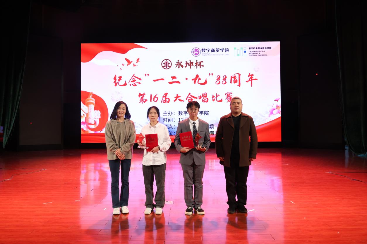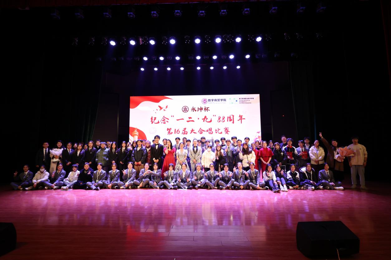 1935年12月9日,数千北平学生在中国共产党的领导和号召下举行了一场抗日救亡爱国运动,极大促进了中国人民的觉醒。88年前,青年学生振臂一挥,奏响爱国主义的乐章;88年后,“天下兴亡、匹夫有责”的爱国主义情怀依旧在青年学生中闪耀光芒。为弘扬“一二·九”运动自强不息、追求真理、勇于实践的民族精神,数字商贸学院12月6日晚在海宁校区小剧场举办纪念“一二•九”运动88周年暨“永坤杯”第十六届大合唱比赛。学校党委副书记周增逵、学校相关职能部门负责人、学院的党政领导班子、全体辅导员和23级班主任共同出席,比赛评委邀请到校学工部、学生处副处长方惠玲,海宁校区综合办副主任谢雯,公共基础部艺术教研室主任李霞和公共基础部黄轶璠老师。